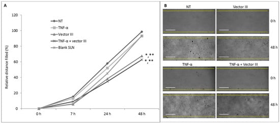 The effect of vector III on HCE-2 cell migration. (A) The evolution of the distance between cells of the edge of the wound; the mean data of reduction of the wound width from the 4 replicates (measures) in each condition. (B) Phase contrast representative images (4×). NT: non-treated cells. Statistics at 48 h. * p < 0.05 respect to NT, ** p < 0.05 respect to cells treated with TNF-α. Scale bar: 60 µm.