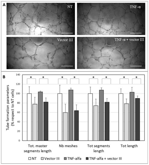Figure 9 shows representative images of HUVEC cells treated with culture medium from HCE-2 untreated or treated with TNF-α, vector III, or TNF-α plus vector III. Both the photographs and the morphometric measurement show the inhibition of the tube formation, in terms of total master segment length, the number of meshes, total segment length, and total length (Figure 9B).