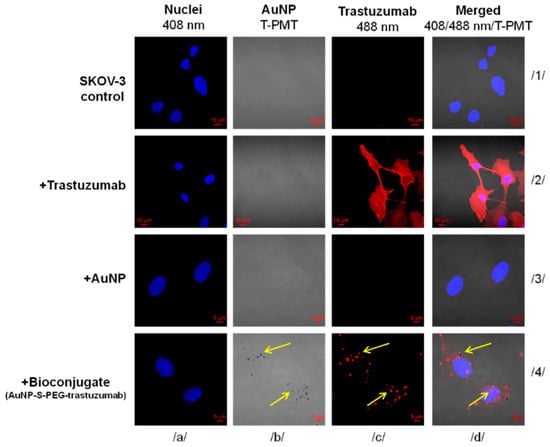 Internalization of free AuNPs and AuNP-S-PEG-trastuzumab bioconjugate by SKOV-3 cells determined by confocal microscopy. SKOV-3 cells that were untreated or treated only with trastuzumab served as positive and negative controls, respectively. Fluorescence signals indicate: (red)—subcellular trastuzumab distribution; (blue)—nuclei intracellular localization. Au-containing particles (dark spots) were visualized with a transmitted light detector (T-PMT). Merged images are presented in column d. Arrows mark the subcellular localization of the AuNP-S-PEG-trastuzumab bioconjugate.