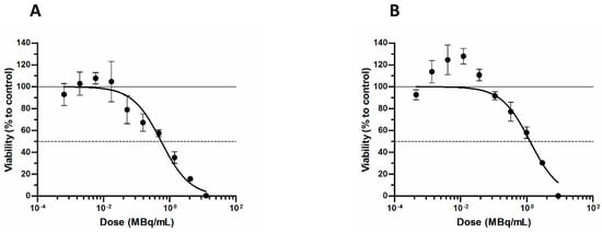 Cytotoxicity studies were performed using 211At-AuNP-trastuzumab and 211At-AuNPs radioconjugates. SKOV-3 cells were plated at a density of 2.0 × 103 cells per well. The next day, the cells were washed twice with cold PBS and radiocompounds (0.0005–12.5 MBq mL−1) were added, in triplicate experiments, to a final volume of 100 µL per well. Cells were incubated at 37 °C for 24 h, washed twice with PBS to remove the unbound fraction, and subsequently incubated at 37 °C for another 48 h as described previously []. For analysis, the CellTiter-96® AQueous-Non-Radioactive (Promega) MTS assay was used. The absorbance in wells was measured at 490 nm using the microplate reader, Apollo 11LB913 (Berthold, Bad Wildbad, Germany). Results are expressed as a percentage of cell viability relative to cells grown in medium only (control).