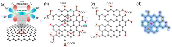 Structures of graphene-based nanomaterials, including pristine graphene (pure-arranged carbon atoms) with sp2-hybridized carbon atoms (a) and the chemically modified graphene: graphene oxide (GO) (b), reduced graphene oxide (rGO) (c), and graphene quantum dot (GQD) (d). Reprinted and adapted with permission from [4]. Copyright MDPI, 2017.