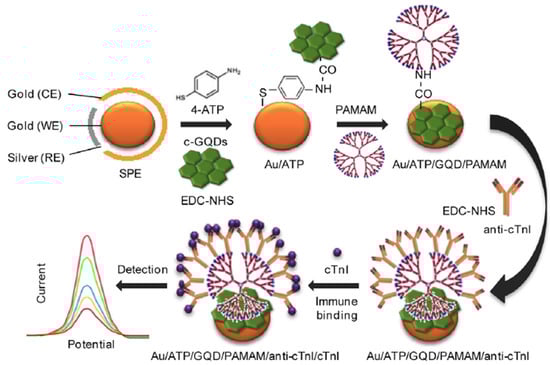 Bhatnagar et al. [10] developed an ultrasensitive electrochemical immunosensor for cardiac troponin I (cTnI) using nanohybrids of GQDs and polyamidoamine (PAMAM) to provide an ultra-high surface area for antibody immobilization as electrode modifiers. In this method, GQDs were covalently coupled through 1-Ethyl-3-(3-dimethylaminopropyl)carbodiimide/ N-Hydroxysuccinimide (EDC/NHS) chemistry on an amino functionalized Au screen-printed electrode. 4-aminothiophenol (4-APT) and the poly(amidoamine) (PAMAM) dendrimer were successively attached to GQDs through EDC coupling to provide an ultra-high surface area for the immobilization of the capture antibody (Figure 2). The recognition of the target protein was monitored by the decrease in the Fe(CN)63- oxidation peak measured by DPV and CV, achieving LODs of 20 and 25 fg mL−1, respectively.