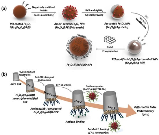 Synthesis of Fe3O4@Ag/GQD NP nanotriplex probe (a) and outline of inmmunosensor preparation (b): drop casting of the nanotriplex probe onto the GCE (Step 1), incubation with CAb (Step 2), blocking with BSA (Step 3), incubation with the target antigen (Step 4), and incubation with the AbD-AuNPs (Step 5). Reprinted with permission from [57]. Copyright Elsevier, 2018.
