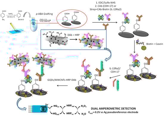 Steps involved in the preparation and functioning of the dual immunosensing platform developed for the amperometric determination of the target biomarkers, IL-13Rα2 and CDH-17, involving the use of MWCNTs/GQDs-HRP-DAb nanocarriers. Figure drawn by ourselves based on [48].