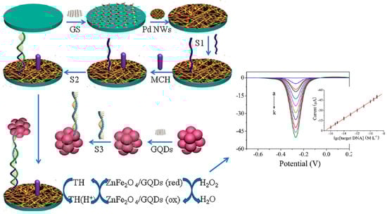 Liu et al. [45] reported an electrochemical sandwich hybridization DNA sensor using magnetic ZnFe2O4/GQDs nanohybrids both as a mimic peroxidase-like enzymatic label and as a nanocarrier of a detector DNA probe (S3). A specific capture DNA probe (S1) was immobilized onto a GCE modified with aminated graphene and Pd nanowires and the captured target DNA (S2, not related to any particular analyte) was sandwiched with the Dp/ZnFe2O4/GQDs. The ZnFe2O4/GQDs nanohybrid exhibited a highly-efficient peroxidase-like catalytic activity, producing large DPV reduction peaks in the presence of thionine (TH) and H2O2 (Figure 5). The DNA sensor showed a wide linear range (10−16–5 × 10−9 M) and low LOD (6.2 × 10−17 M) as well as a good performance in the analysis of spiked human serum samples.