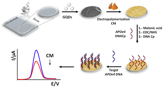Schematic representation of the electrochemical DNA biosensor developed to sense Alzheimer’s and artery coronary diseases using CM/GQDs as surface modifier of the ITO electrode. Reproduced and adapted with permission from [58]. Copyright Elsevier, 2018.