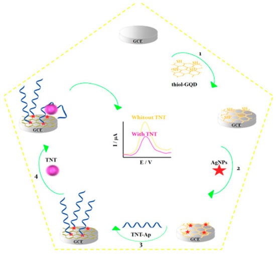 Only one electrochemical aptasensor has been reported to date involving the use of GQDs. Shahdost-fard and Roushani [59] developed a label-free aptasensor for the detection of 2,4,6-Trinitrotoluen (TNT) by immobilizing an amino-modified aptamer (NH2-Ap) onto a GCE modified with an AgNPs/thiol-GQD nanocomposite. It is important to note that the same group used this nanocomposite to develop immunosensing platforms [56]. AgNPs were employed as a linker between thiol-GQDs and the NH2-Ap and also to increase the aptamer loading on the GCE. The decrease in the DPV oxidation signal of Rutin (RU), used as a redox probe, after recognition of TNT was the analytical readout (Figure 7). The aptasensor achieved an LOD of 0.33 fM and was employed to analyze spiked soil and water samples.