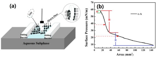Figure 2. (a) Schematic of the Langmuir-Blodgett experimental setup; (b) surface pressure versus area (π−A) isotherm of GO.