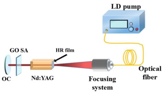 GO-22 SA and GO-38 SA samples were inserted in a laser linear cavity (see Figure 3). The concentration of Nd3+ of the Nd:YAG crystal is 1.2 at%. Its dimensions were 3 × 3 × 5 mm3 and the crystal was cut in [111] direction. One of the end crystal surfaces was coated with a high transmission film transmitting at 808 nm and a high reflection film reflecting at 1064 nm. One of the end surfaces of the crystal was coated with a high transmission film (transmitting at 808 nm) and a high reflection (HR) film (reflecting at 1064 nm). This crystal was pumped by an 808 nm diode laser (DL) with a 30 W maximum output power. We designed a 1 cm long laser cavity. The output coupler (OC) (R = ∞) was an output coupler with the transmission of 3% at 1064 nm. The laser temperature was maintained at 16 °C by a chilled water-based cooling equipment to keep the output stable. GO SA samples were inserted into the laser cavity close to the OC. A 1 GHz oscilloscope (Rohde & Schwarz, RTO1014, Munich, Germany) is used for the measurement.