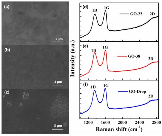 Figure 4 shows SEM images of the sample as well as their Raman spectra. The surface of the GO films fabricated by the drop coating method showed a large accumulation and wrinkles (see Figure 4c). In contrast, GO films prepared by the LB technique, GO-22 (shown in Figure 4a) and GO-38 (shown in Figure 4b) were more uniform. These results agree with the π−A curve, indicating that coatings compressed in the solid region are typically more compact then those compressed in the liquid zone. Raman spectra showed three characteristic peaks: 1D peak at 1356.5 cm−1,1G peak at 1604.9 cm−1 and 2D peak at 2739.6 cm−1 for the GO-22 sample and 1D peak at 1351.1 cm−1,1G peak at 1601.7 cm−1 and 2D peak at 2738.2 cm−1 for the GO-38 sample (see Figure 4d,e, respectively). 1D, 1G and 2D Raman bands associated with the GO film obtained by drop coating were observed at 1346.4 cm−1, and 1600.1 cm−1 and 2732.6 cm−1, respectively (see Figure 4f). Thus, the peak positions for GO coatings obtained using different methods were similar [15,40].