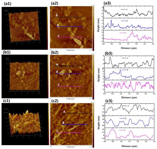 Sizes and thicknesses of the as-prepared GO-22, GO-38 and GO-Drop samples were determined by AFM. 3D topographical images of the GO-22, GO-38 and GO-Drop samples are shown in Figure 5(a1–c1), respectively. Their corresponding 2D images are shown in Figure 5(a2–c2), respectively. To determine film thicknesses, three different sections were chosen for the measurements (see Figure 5(a3,b3,c3)). From Figure 5(a3,b3) we estimated that the thickness of GO in the solvents was 1–6 nm. Since the thickness of a single GO layer is ~1 nm, our prepared films were probably composed of five or more layers of GO. However, the thickness of the GO-Drop film was 20–80 nm (see Figure 5(c3)), and the uniformity of the film was much worse than the film prepared by LB.