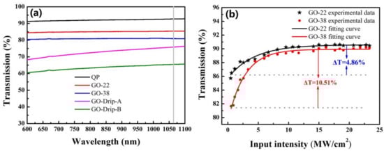 Linear transmittances of the quartz plate (92.7%), GO-22 SA (85.4%) and GO-38 SA (81.1%) were measured, respectively (see Figure 6a). Their transmittance changes slightly with the increase of the wavelength. However, transmittances of the A and B areas (A~16 mm2, B~16 mm2) located on the GO-Drop sample surface were 76.2 and 65.5%, respectively, which indicates a significant variation in thickness (as shown in Figure 1e). Experimental data were fitted using the following equation [20]: Τ(I) = 1 − ΔΤexp(−I/Isat) − Τns, where T(I) is the transmission, ΔT is the modulation depth, I is the input intensity, Isat is the saturation intensity and Tns is the non-saturable loss. Values of ΔT, Isat, and Tns for the GO-22 SA sample were determined to be 4.86%, 4.26 MW/cm2, and 9.06%, respectively. Similar values for the GO-38 SA sample were 10.51%, 2.73 MW/cm2 and 8.99%, respectively (see Figure 6b).