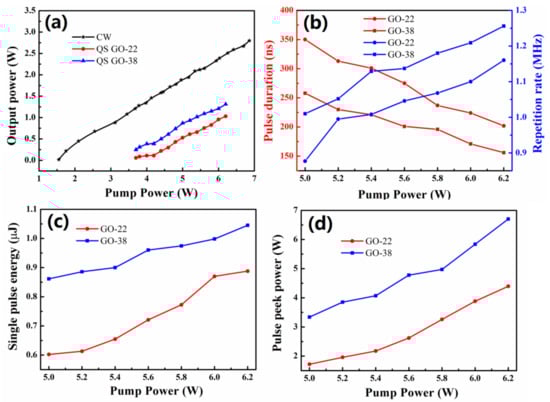 Figure 8. (a) Average output power of CW and QS as a function of the pump power; (b) repetition rates and pulse durations as a function of the pump power. Single pulse energy (c) and peak power (d) from passively Q-switched Nd:YAG laser versus incident pump power with GO-22 and GO-38 SAs.