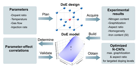 Herein, we present a comprehensive parametric study of the synthesis of N-CNTs to achieve targeted nitrogen contents with maximum graphitization and aspect ratios. Toluene and pyridine were used as precursors since our experience showed most promising results for compounds exhibiting aromaticity. Statistical design of experiments (DoE) was applied, a parametric approach to describing single experimental responses (in this case nitrogen content, graphitization, aspect ratio, and homogeneity) as polynomial functions of the investigated factors. The presented models give quantitative information about parameter influences and their interaction with each other. Furthermore, it leads to accurate predictions within the design space allowing for a systematical optimization of material properties with a minimum number of experiments [43,44,45,46].