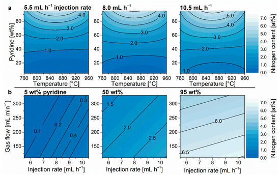 Model plots of nitrogen content in dependency of reaction temperature and pyridine ratio in the reaction feedstock for different injections rates (a) and in dependency of injection rate and carrier gas flow at various pyridine ratios (b).