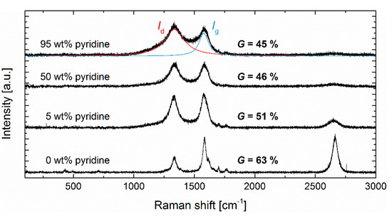 Transition of Raman spectra from neat to doped CNTs using different pyridine ratios. Signals of disordered and graphitic vibration modes are highlighted in red and blue, respectively.