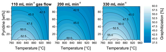 Model plots of graphitization in dependency of synthesis temperature and pyridine ratio in the reaction feedstock at various carrier gas flows.