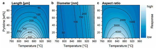 Model plots for the N-CNT dimensions are shown in Figure 8. A clear correlation between the length and the graphitization appears (compare Figure 6). Such a correlation can be related to the fact that defects impair the growth of CNTs. This compliance benefits the simultaneous optimization of the properties. Hence, the model would allow achieving N-CNTs with aspect ratios higher than 103 which is in the same order of magnitude as undoped CNTs optimized in the herein used system [23,33,55]. The significant effect of growth temperature on the CNT diameter was also observed in previous studies [6,30,31] and can be explained by an increased amorphous carbon shell around the catalyst particles due to faster segregation leading to higher amounts of CNT walls [40].