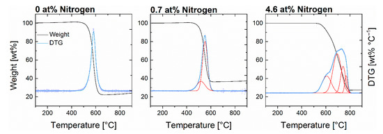 Thermogravimetric analysis of N-CNTs with various nitrogen content. Peak integration of the derivative thermogravimetric signals with Gauss functions reveals a signal broadening attributed to various decomposition processes.