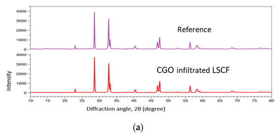 The symmetrical LSCF/CGO/LSCF were infiltrated with CGO and LSC inks in an identical procedure. XRD study of the reference and the CGO infiltrated cathode did not find any detectable structural differences between these after calcination at 700 °C (see Figure 5a). This observation was in agreement with previously reported data that the interaction between LSCF and CGO at these temperatures is negligible due to the low solubility of Ce and Gd in LSCF [41]. SEM cross-sectional images of symmetrical LSCF/CGO/LSCF cells infiltrated with CGO and LSC inks (as-sintered and after 72 h of testing (aging)) are presented in Figure 5b. The total nanoparticle loading was ~10 wt %. The images of the as-sintered cell reveal uniform coverage of the scaffold with fine nanoparticles. After an Electrochemical Impedance Spectroscopy EIS testing for 72 h the CGO particles tended to form characteristic “chains” of larger nanoparticles approximately 30 nm in size, while the LSC infiltrate was clearly aggregated in large “rug–type” formations of nanoparticles approximately 50–100 nm in size. EIS tests were done at 700 °C in air before and after aging for 72 h. The relevant Nyquist and Bode plots for the reference and the infiltrated cathodes (see Figure 5c) reveal a significant deterioration of the catalytic properties of the reference electrode due to the increase in low frequency losses. The effect was assigned to Sr surface segregation. At the same time, the change in the polarization resistances of infiltrated cells was much smaller in comparison, with a more substantial increase in high frequency losses for the LSC infiltrated cell. The estimated ASR values for the reference electrode and the infiltrated electrodes before and after aging are summarized in the inset of Figure 5c. While the ASR for the LSC infiltrated cathode showed an increase of ~65%, the CGO electrode was significantly more stable (~30% increase in ASR). Energy-dispersive X-ray spectroscopy (EDX) point mapping of La and Sr of the scaffold produced after 72 h of aging is presented in Figure 5d. It confirmed a significant Sr depletion of the LSCF grain volume (La/Sr) at % ratio of ~1.9 in comparison with (La/Sr) at % ratio of ~1.6 for the infiltrated cells, which was close to the original LSCF powder value.