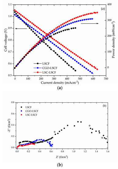 - Lou, X.; Wang, S.; Liu, Z.; Yang, L.; Liu, M. Improving La0.6Sr0.4Co0.2Fe0.8O3−δ cathode performance by infiltration of a Sm0.5Sr0.5CoO3—δ coating. Solid State Ion. 2009, 180, 1285–1289. [Google Scholar] [CrossRef]