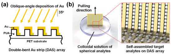The sample preparation process is illustrated in Figure 1. Initially, one-dimensional grating patterns with a period of 200 nm (1:1 line/space) and a height of 100 nm were generated on polyurethane acrylate (PUA)-coated polyethylene terephthalate (PET) substrate by UV-nanoimprint lithography. Then, a 30 nm-thick Au film was thermally evaporated at an oblique angle to the polymer nanograting. Because of the tilted deposition angle (35° from the surface normal direction) and a shadowing effect of the line grating, a double-bent Au strip (DAS) array was spontaneously formed in two steps, namely, UV-nanoimprint lithography and Au deposition. More details on the fabrication of DAS arrays can be found in our previous report, in which the refractive index sensitivity of about 210 nm refractive index unit (RIU)−1 and a figure of merit (FOM) of 4.2 for DAS arrays were demonstrated [19].