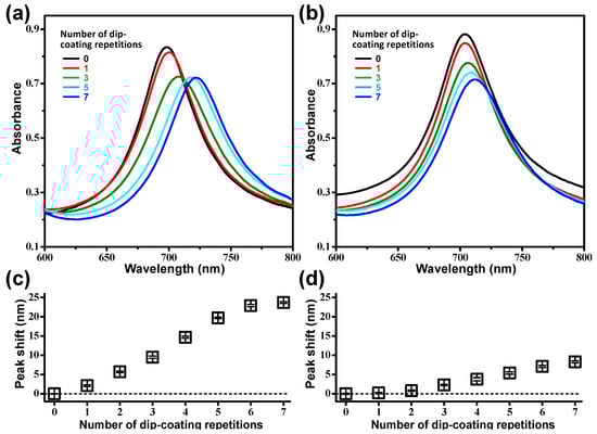 The valleys between the Au strips not only accommodate PS beads by capillary forces, but also act as hosts to strong plasmonic fields due to the interactions between adjacent strips, as was demonstrated in experimental and simulation studies [25]. Therefore, the PS beads self-assembled in the valley between the DAS arrays can induce a change in the resonance conditions of the Au strips, resulting in a spectral shift of the LSPR wavelength. Figure 3 shows the LSPR shifts of the per- and par-dip samples depending on the number of dip-coating repetitions. The LSPR peak shifts of the par-dip samples were much larger than those of the per-dip samples due to a greater number of dense bead deposits on the sample surfaces. This observation is in good agreement with the SEM images in Figure 2. As the LSPR peak shift was accompanied by a change in the amplitude of absorbance, as shown in Figure 3a,b, it would be possible to monitor the change in absorbance at a specific wavelength (e.g., the initial resonant wavelength) as an alternative signal reading method.