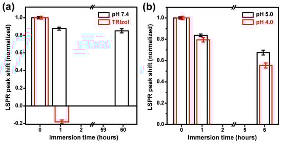 Normalized LSPR peak shifts measured by exosome-coated DAS arrays. After dip-coating thrice with exosomes, the samples were immersed in a TRIzol reagent (red bars in (a)) and buffer solutions with pH 7.4 (black bars in (a)), 5.0 (black bars in (b)), and 4.0 (red bars in (b)). The peak shifts were divided by the initial shift values, measured after dip-coating thrice with exosomes for each sample.