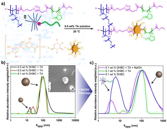 In order to shift the equilibrium between unimers and aggregates toward aggregate formation by an enhanced self-assembly stability, the aggregates were attempted to be crosslinked with TA (Figure 2a). TA is well-known for its supramolecular complexation with PVP polymers [63]. Crosslinking experiments via hydrogen bonding were conducted by diluting a 10 wt.% PVP-b-P(OEGMA) solution to 2.0 wt.% via a 0.5 wt.% aqueous TA solution (see SI for details). The crosslinking reaction takes place instantly, and is visually observed by a slight turbidity of the solution. Noteworthy, adding a TA solution of higher concentration (0.6 wt.%) resulted in sedimentation of the polymer–TA aggregates. This shows the strong supramolecular complexation of TA with the PVP of DHBC, while a diluted TA solution (0.3 wt.%) does not show a significant promotion of large aggregate formation. Rather, a disassembly is observed due to dilution after addition of the TA solution. Thus, a ratio of 1:7 (PVP-b-P(OEGMA):TA) indicates a strong non-covalent crosslinking. While diluting, the phenolic hydroxide groups undergo strong hydrogen bonding with the peptide-like functional groups of PVP located within the DHBC. Complex formation appears not only fast, but also appears stable up to the boiling point of water. This may qualify for a simple and straightforward technique to stabilize the DHBC aggregates. Non-covalent crosslinking could also be followed via Fourier transform infrared (FT-IR) spectroscopy (Figure S5). A clear broadening of the OH-stretching vibration of TA after crosslinking indicates the existence of hydrogen bonds stabilizing aggregate formation.