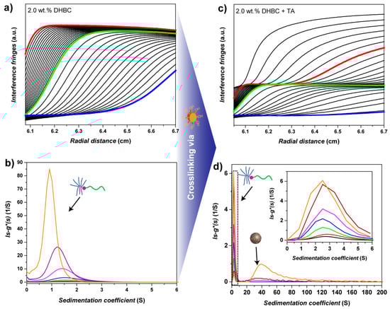 Another solution-based analytical method to study colloidal structures is analytical ultracentrifugation (AUC). AUC is a well-known method that enables following the sedimentation of colloidal structures in the dispersed or dissolved state. The method can provide absolute information of the colloid distribution based on typically employed concentration-sensitive detection. In recent reports, AUC failed in the identification of aggregates that were observed by the utilization of other analytical methods in studying pure DHBC and its aggregates so far [29,35]. In the present study, we utilized concentration-sensitive RI detection for the observation of sedimentation boundaries in sedimentation velocity experiments. Figure 3a clearly shows the apparent observation of a single boundary of aqueous PVP-b-P(OEGMA) solutions at 2 wt.% concentration. Notwithstanding, after non-covalent crosslinking, aggregates of DHBC were clearly identified via AUC at the same concentration (Figure 3c).
