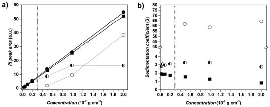 Again, the sedimentation velocity profiles of non-crosslinked PVP-b-P(OEGMA) has a one-step profile, which roughly corresponds to a single population of species in solution (Figure 3a). Surprisingly, we found the absence of larger structures. This could be explained by their overrepresentation in DLS-derived intensity-weighted size distributions that over-express the abundance of larger structures in solution. In most of the recent studies, intensity-weighted DLS investigations have been utilized as well, demonstrating the necessity of other in-depth studies to reconcile the dynamics in solution; most prominently, analytical ultracentrifugation failed [29,35]. The present study indicates the existence of aggregates under certain conditions. Furthermore, considering the timescale of the sedimentation velocity experiments, together with the dynamic nature and the weak hydrophilic–hydrophilic interactions of the aggregates, may make the observation of a distinct population abundance in AUC with RI detection impossible. Interestingly, decreased concentrations of the polymer (Figure 3b and Figure 4a) led to a shift of the sedimentation coefficient distribution toward larger values, which is a strong indication of non-ideality observed at these rather high concentrations of the polymer in solution (Figure 3b and Figure 4b) [66,67]. However, the sedimentation profiles of non-covalently crosslinked aggregates with TA show a step in the sedimentation velocity profiles. This could only be the result of two clearly distinct species moving at distinctly different speeds in the centrifugal field (Figure 3c). The apparent sedimentation coefficient distribution of suspected “unimers” and the non-covalently crosslinked aggregates is shown in Figure 3d. The first population at an apparent sedimentation coefficient of 2.5 S (signal weight average), and being largely independent of concentration appears to be the result of PVP-b-P(OEGMA) “unimers” (Figure 4b). The apparent second population located at ca. 60 S (signal weight average) indicates the existence of non-covalently crosslinked aggregates formed by the DHBC and TA (Figure 3d and Figure 4b). In contrast to Figure 3b, the sedimentation coefficient distributions of species located around 3 S shows less concentration dependency (as seen by the magnification in the inset of Figure 3d and in Figure 4b). The population of species observed at higher sedimentation coefficients indicates the existence of aggregates with increased abundance at increased concentrations of polymer in solution (Figure 4a, empty circles versus half-filled circles). Interestingly, the total amount of material observed in sedimentation velocity experiments appears readily similar (Figure 4a, filled circles and filled squares), indicating the overall correctness of the mass balance.