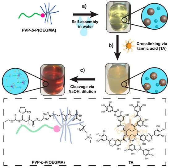 The concept of supramolecular chemistry allows the introduction of dynamics into molecular systems [44,45], e.g., via hydrogen bonding [46], host–guest complexes [47], or metal complexation [48]. Supramolecular interactions are particularly interesting for reversible crosslinking [49,50]. In that regard, tannic acid (TA) is a very useful compound to non-covalently crosslink the formed self-assemblies from PVP-b-P(OEGMA), as the interaction of tannic acid and PVP is well known not only from science, but also from the fining of red wine. It readily forms hydrogen bonds due to its acidic phenolic hydroxyls with a significant number of molecules, such as proteins and polymers, including PVP [51], which can be exploited in the formation of nanostructures [52,53,54]. Moreover, TA belongs to the group of tannins and can be found in wine, beer, tea, and nuts. Therefore, TA represents a natural and renewable product that is also approved by the Food and Drug Administration. Therefore, TA gained a lot of attention recently, last but not least because of its utilization in biomedical applications [55,56].