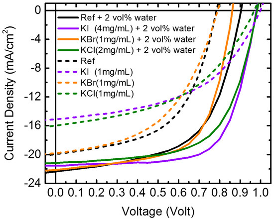 Photocurrent density–voltage (J–V) curves of perovskite solar cells prepared without and with water and/or potassium halide additives under their optimized concentrations.