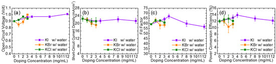 The changes in (a) VOC; (b) JSC; (c) FF (fill factor); (d) power conversion efficiency (PCE) of the potassium halide-doped devices with 2 vol% water co-doping as a function of doping amounts of KI, KBr, and KCl.