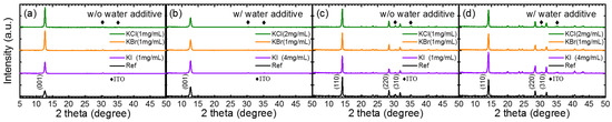 Figure 3 shows comprehensive XRD analyses of the potassium halides-doped PbI2 and MAPbI3 films with and without water incorporated with PbI2. The PbI2 and MAPbI3 films were deposited on ITO/PEDOT:PSS. Without water, the XRD intensity increased markedly for all the KCl-, KBr-, and KI-doped PbI2 films (Figure 3a). However, the XRD of the MAPbI3 films prepared on the potassium-doped PbI2 were similar to that without doping (Figure 3c). Water incorporation increased the XRD intensity of PbI2, but did not affect the XRD intensity of the perovskite film (Figure 3a,c). Co-doping of water and potassium halide increased the XRD intensity of both the PbI2 and MAPbI3 significantly (Figure 3b,d). The increase in the XRD intensity was also accompanied by an increase in the grain size.