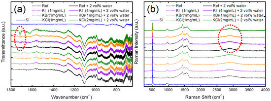 To exploit the effect of co-doping water and potassium halides in the PbI2 layer, the Fourier transform infrared spectroscopy and Raman spectroscopy were adopted, as shown in Figure 6. The PbI2 films were prepared on Si/PEDOT:PSS because glass absorbs the IR light. In Figure 6a, characteristic peaks related to the C=O stretching were found around 1715 cm−1 [22]. According to the literature, the C=O vibration shifts to lower frequency around 1650 cm−1 for DMF, which forms Lewis adducts due to the reaction of the PbI2 layer [23,24]. In our sample, the C=O stretching was found to be blue-shifted, which might be caused by the formation of a PbI2-DMF-H2O adduct by incorporating water through a Lewis acid–base reaction. The other possibility was that the PbI2-DMF precursor reacted with the PEDOT:PSS under-layer because of the incorporation of water by partially dissolving the PEDOT:PSS near the PbI2/PEDOT:PSS interface. A similar observation has been reported by Winther et al. [25]. Figure 6b shows the Raman spectra of the PbI2 layer with or without potassium halides and water. Si-related signals were found at 521 cm−1 (Si–Si LO), 940, and 987 cm−1 (Si–OH) [26]. Notably, the O–H and C–H stretching of PEDOT split into two peaks at 2865 and 2945 cm−1, owing to the incorporation of metal halides and water, particularly for KBr- and KCl-doping [27]. Evidence from FTIR and Raman spectroscopies indicated that the doping of water and potassium halides could form some new adducts and change the interfacial chemistry near the PbI2/PEDOT:PSS.