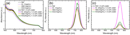 Figure 7 displays the absorption spectra (Figure 7a) and PL spectra (Figure 7b,c) of the perovskite-glass structures prepared on the PbI2 layers that were doped with water, potassium halides, and potassium halides and water co-dopants. In the visible region (470–800 nm), the absorbance of the MAPbI3 on PbI2, prepared with the co-doped potassium halides and water, increased, indicating improved crystallinity. With potassium-only additives, the absorbance of MAPbI3 decreased. The PL-quenching effect of KBr-doping was observed (Figure 7b), while PL enhancement was found in the KI- and KCl-doped films. The steady-state photoluminescence (PL) was an effective way to detect the trap states within the perovskite layer. The higher PL intensity indicated fewer traps or defects within the films and improved crystallinity. Figure 7c shows the PL spectra of the co-doped water and potassium halides for MAPbI3 films. The PL intensity of the perovskite films obviously increased by co-doping, except for the KBr-doped film. In particular, the PL intensity of the co-doped KI and water increased by five times. Therefore, it was concluded that the co-doping of water and potassium halides increased the grain size of MAPbI3 and eliminated radiative defects that contributed to the strong PL response.