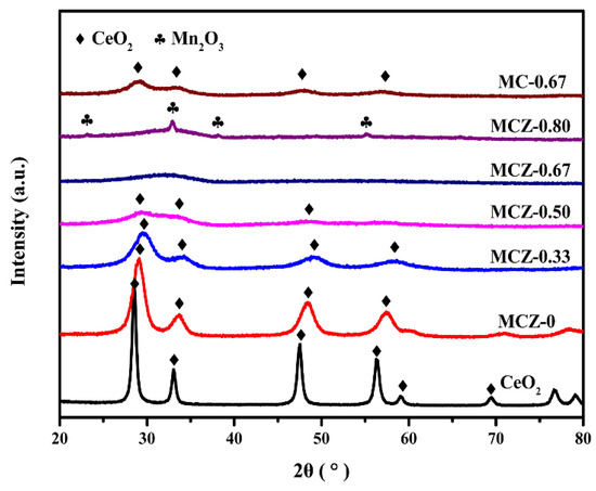 XRD patterns of MCZ-x and MC-0.67 catalysts showed that the crystallinity of the prepared catalysts was significantly affected by Mn content (Figure 1). For the MCZ-x (x = 0, 0.33, 0.50) and MC-0.67 catalysts, only diffraction peaks corresponding to the cubic fluorite-like structure of CeO2 were observed, with the lattice parameters (Table 1) being smaller than 5.41 Å of pure CeO2 (JCPDS #43-1002). Indeed, the ionic radii of Mnn+ (Mn2+ = 0.083 nm, Mn3+ = 0.065 nm, Mn4+ = 0.053 nm) and Zr4+ (0.084 nm) are both smaller than that of Ce4+ (0.097 nm) [29,33]. Thus, the shrinkage of CeO2 unit cell indicates that parts of Ce4+ ions in CeO2 lattice were replaced by Mnn+ and Zr4+ ions to form a solid solution. Remaining Mn- and Zr-related oxides may be uniformly distributed on the surface of CeO2 in a poor crystalline state. At the 2θ range from 24° to 40°, only a weak and widened peak was observed for the MCZ-0.67 catalyst, indicating that it exists in an amorphous state. With the further increase of Mn content, weak diffraction peaks indexed to Mn2O3 (JCPDS #24-0508) were observed for the MCZ-0.80 catalyst, showing that the Mn content has exceeded the maximum that the CeO2 lattice can hold and therefore Mn2O3 phase is formed during calcination.