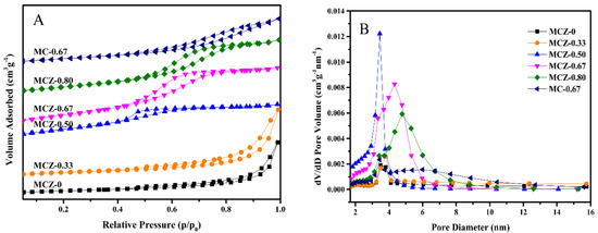 N2 adsorption-desorption isotherms (A) and pore size distributions (B) of MCZ-x (x = 0, 0.33, 0.50, 0.67, 0.80) and MC-0.67 catalysts.