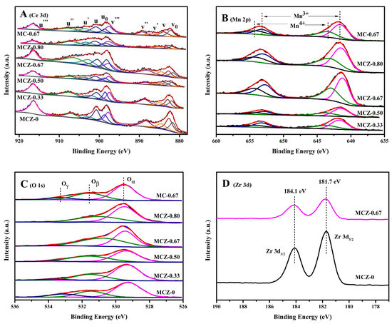X-ray photoelectron spectroscopy (XPS) spectra of Ce 3d (A); Mn 2p (B); O 1s (C) and Zr 3d (D) of MCZ-x (x = 0, 0.33, 0.50, 0.67, 0.80) and MC-0.67 catalysts.