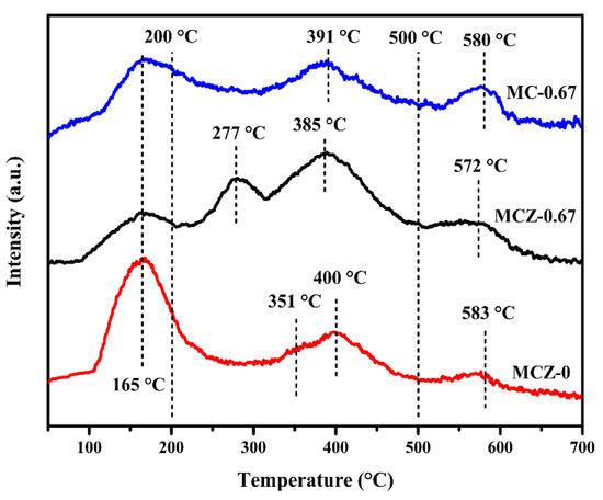 The distribution of oxygen species was also explored by O2-TPD for the MCZ-0, MCZ-0.67 and MC-0.67 catalysts (Figure 5). The desorption peak below 200 °C was attributed to physically adsorbed oxygen molecule (O2), while the desorption peaks within 200–500 °C were ascribed to chemisorbed oxygen species (O2− and O−, where O2− is easier to desorb than O−). The desorption peak observed above 500 °C was attributed to surface lattice oxygen (O2−) [41].