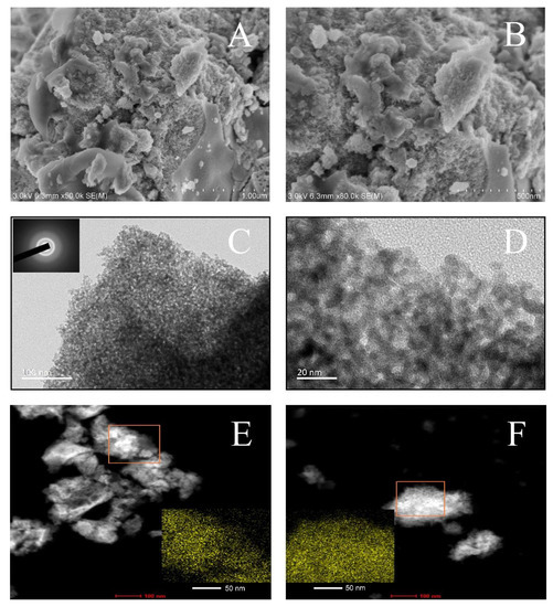 The correlation between the catalytic performance and morphological characteristics of the promising MCZ-0.67 catalyst was studied using SEM and TEM. Figure 6A,B showed that the MCZ-0.67 catalyst presented sponge-like surface with a large degree of porosity, in agreement with its large BET. Closer observation using TEM (Figure 6C,D) showed that this catalyst was composed of well-distributed nanoparticles with a size of 6–10 nm, and their accumulation led to the formation of mesopores with a size of 3–9 nm. This morphology could contribute to the good catalytic performance to some extent by providing a large quantity of adsorption sites [45]. It is reported that nanoparticles showed promising applications for catalytic reactions due to their high surface-to-volume ratio [46]. The selected area electron diffraction (SAED) pattern exhibited in the inset further confirmed that the prepared MCZ-0.67 catalyst is amorphous since no typical diffraction rings or spot patterns were observed [47], in agreement with the results of the XRD characterization. The bright squares in Figure 6E,F indicated that the concentration and distribution of Mn species in MCZ-0.67 catalyst were better than those in MCZ-0.33 catalyst. As reported, the content and distribution of active Mn species can greatly influence the performance of the catalyst [48].