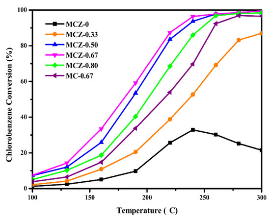 The catalytic activity of MCZ-x (x = 0, 0.33, 0.50, 0.67, 0.80) and MC-0.67 catalysts for chlorobenzene (CB) combustion; gas composition: 1000 ppm CB, 21% O2; gas hourly space velocity (GHSV) = 20,000 h−1.
