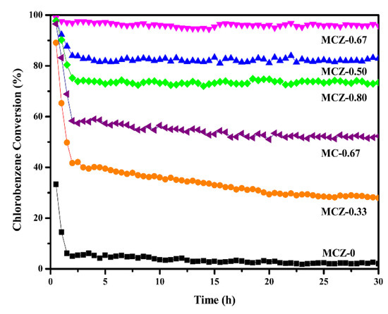 Stability tests of MCZ-x (x = 0, 0.33, 0.50, 0.67, 0.80) and MC-0.67 catalysts for CB elimination during 30 h of continuous reaction at 300 °C, gas composition: 1000 ppm CB, 21% O2; GHSV = 20,000 h−1.