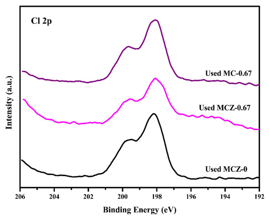 Chlorine resistance was assessed according to the Cl 2p XPS spectra of the used MCZ-0, MCZ-0.67 and MC-0.67 catalysts after the stability tests (Figure 9). The two overlapping peaks appearing at approximately 198.1 eV and 199.6 eV were attributed to the Cl 2p3/2 and Cl 2p1/2 core levels, respectively [54]. Their presence confirmed the occurrence of chlorine deposition on the catalyst surface. Specifically, according to the estimation from the peak area of Cl 2p3/2, the surface chlorine content of the used MCZ-0, MCZ-0.67 and MC-0.67 catalysts was 5.9 at%, 4.0 at% and 5.2 at%, respectively. Obviously, the MCZ-0.67 catalyst had the best chlorine resistance, with Zr addition effectively inhibiting chlorine poisoning.