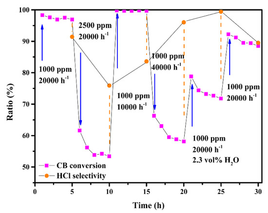 Apart from time-based stability, the practical application process subjects catalysts to complicated and variable operating conditions. Therefore, the successive influence of CB concentration, space velocity and water vapor on CB elimination and HCl selectivity ([HCl]/([HCl] + [Cl2])) were studied for the MCZ-0.67 catalyst at 300 °C (Figure 10). Both higher CB concentration (2500 ppm) and space velocity (40,000 h−1) led to a serious decrease in activity (lower than 60%), while lower space velocity (10,000 h−1) resulted in an almost complete elimination of CB. The influence of CB concentration indicated that the catalytic efficiency would be overloaded when handling a large amount of reactants, and the influence of lower space velocity was attributed to a more sufficient oxidation caused by the longer residence time of reactants through the catalyst bed. Meanwhile, Deacon reaction (the generation of Cl2) was similarly influenced, as can be seen from the higher HCl selectivity at greater space velocity. Under water vapor condition (2.3 vol%), the conversion of CB dropped to 72%, which is attributed to the competitive adsorption of CB and H2O on the surface active sites [55]. In contrast, the selectivity of HCl was as high as 99%, showing that water can effectively inhibit the generation of Cl2. According to previous report, the flowing water vapor can wash the catalyst surface and promote the formation of HCl by the dissociated chlorine species [56]. Thus, as shown above, despite undergoing various operating conditions, CB conversion was maintained at approximately 90%, further confirming the good catalytic performance of the MCZ-0.67 catalyst.