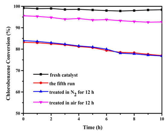 Catalytic combustion is a heterogeneous catalytic oxidation process, varying from homogeneous catalysis, catalysts used in the tests can be easily separated from the reaction system [57]. Thus, it is of great significance to explore the reuse of catalysts (Figure 11). After the fourth reaction run, MCZ-0.67 catalyst suffers a decrease in catalytic efficiency from 98% (fresh catalyst) to approximately 80% at 300 °C. Regeneration was carried out by calcining the above used catalyst at 350 °C for 12 h in air and nitrogen atmosphere respectively. As shown in Figure 11, after treatment in air, the activity of MCZ-0.67 catalyst recovered to approximately 95%, while that of the catalyst treated in nitrogen remained almost unchanged. This phenomenon indicates that the presence of oxygen contributes to the regeneration of the catalyst and the used MCZ-0.67 catalyst can be recycled by calcination in air. The re-enhancement of catalytic activity may be attributed to the reaction of oxygen species with chlorine species at high temperature, which exposes the active sites occupied by chlorine species again [11].