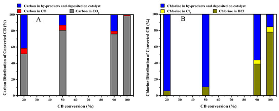 Carbon distribution (A) and chlorine distribution (B) of converted CB at different conversion rates over the MCZ-0.67 catalyst.