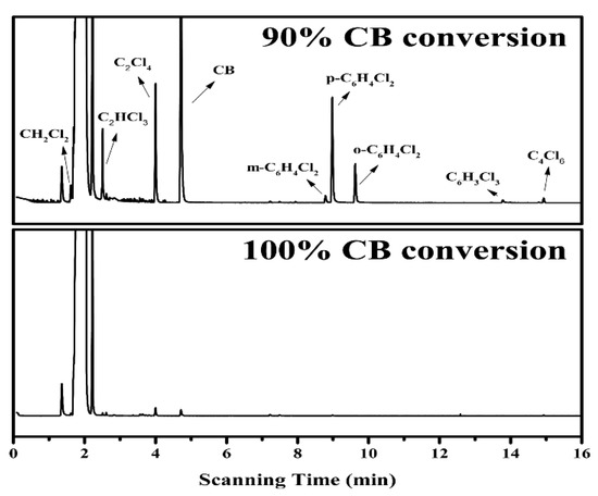 The production of polychlorinated by-products is inevitable during the oxidation of chlorinated aromatic hydrocarbons due to the strong reactivity of chlorine species. Thus, an evaluation of the CB decomposition products is required. Herein, the GC-MS method was employed for the detection of probable trace products (Figure 13), showing that various polychlorinated by-products were produced at 90% CB conversion, including dichlorobenzene (C6H4Cl2, ortho—6 ppm, meta—2 ppm, para—16 ppm), tetrachloroethylene (C2Cl4, 15 ppm), trichloroethylene (C2HCl3, 7 ppm), dichloromethane (CH2Cl2, 3 ppm) and trace amounts of trichlorobenzene (C6H3Cl3, <1 ppm) and hexachlorobutadiene (C4Cl6, <1 ppm). Their presence directly confirms the occurrence of chlorination reactions during CB oxidation and clearly depicts the break-down process of the C–C bond from a hexatomic ring to a short chain. It has been previously reported that the formation of these polychlorinated by-products is initiated from the electrophilic substitution of chlorine species [55], and according to the chlorine distribution during CB oxidation (Figure 12B), it can be reasonably speculated that the chlorine species dissociated from the catalyst surface and the Cl2 resulting from the Deacon reaction are responsible for the substitution reaction. In addition, it is well acknowledged that the destruction of CB molecule begins with dechlorination reaction due to the lower dissociation energy of the C–Cl bond than that of C–H bond [49], and the resulting intermediate benzene is then further ring-opened and oxidized by active oxygen species. Herein, among the products of CB decomposition, benzene, the incomplete oxidation product of CB, was not detected, while it is the only organic by-product during the oxidation of CB over Mn0.8Ce0.2O2 catalyst [55]. This phenomenon may be ascribed to the competitive adsorption for the same active sites between polychlorobenzene and benzene; herein, benzene seems to be preferentially oxidized over the MCZ-0.67 catalyst. This result may be correlated to the higher electron cloud density of benzene than that of polychlorobenzene, thus facilitating the formation of π-complex in the adsorption process [52]. As the reaction temperature increases, these small amounts of polychlorinated by-products can be further oxidized under the strong oxidation ability of active oxygen species, as evidenced from the observations in Figure 13, wherein the corresponding peaks are almost invisible at 100% CB conversion. Based on the above analyses, a possible reaction path of CB oxidation over the MCZ-0.67 catalyst was proposed and presented in Scheme 1.