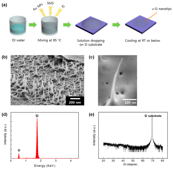 To make an aqueous solution, KI powder (0.002 mol, Sigma-Aldrich, Seoul, Korea) and 10 mL of Au NPs (3 nM, particle size = 20 nm, Sigma-Aldrich, Seoul, Korea) dispersed in H2O were mixed in 80 mL of deionized water. Subsequently, 20 mL of 30% aqueous SMS (Gelest, Morrisville, PA, USA) was added to the mixed solution. In order to mix the solution properly, the aqueous solution was stirred magnetically at 85 °C on a hot plate. Then, samples were prepared by dropping aqueous solution onto the Si substrate. All samples were cooled down 4 °C or room temperature (RT), or maintained at 70 °C over 24 h until the solution droplets dried. The structural, compositional, and optical properties of the samples were investigated using scanning electron microscopy (SEM, SU-8230, Hitachi, Japan), energy-dispersive X-ray spectrometry (EDX, SU-8230, Hitachi, Japan), X-ray diffraction (XRD, X’pert Pro Powder, PANalytical, Netherlands), transmission electron microscopy (TEM, HD-2300A, Hitachi, Japan), and PL (SpectraPro 500i, Acton, USA). To further investigate the growth mechanism of the a-Si nanotips on the Si substrate, focused ion beam (FIB)-SEM (FB-2100, Hitachi, Japan) and atomic force microscopy (AFM, MOD-1M series, Nanofocus, Richmond, VA, USA) analyses were also performed.